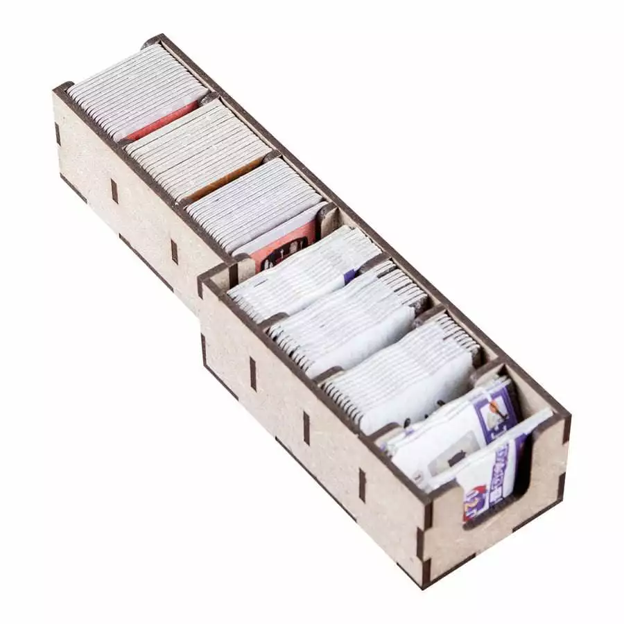 Designed to fit into the game box. Designed for both sleeved and unsleeved cards.