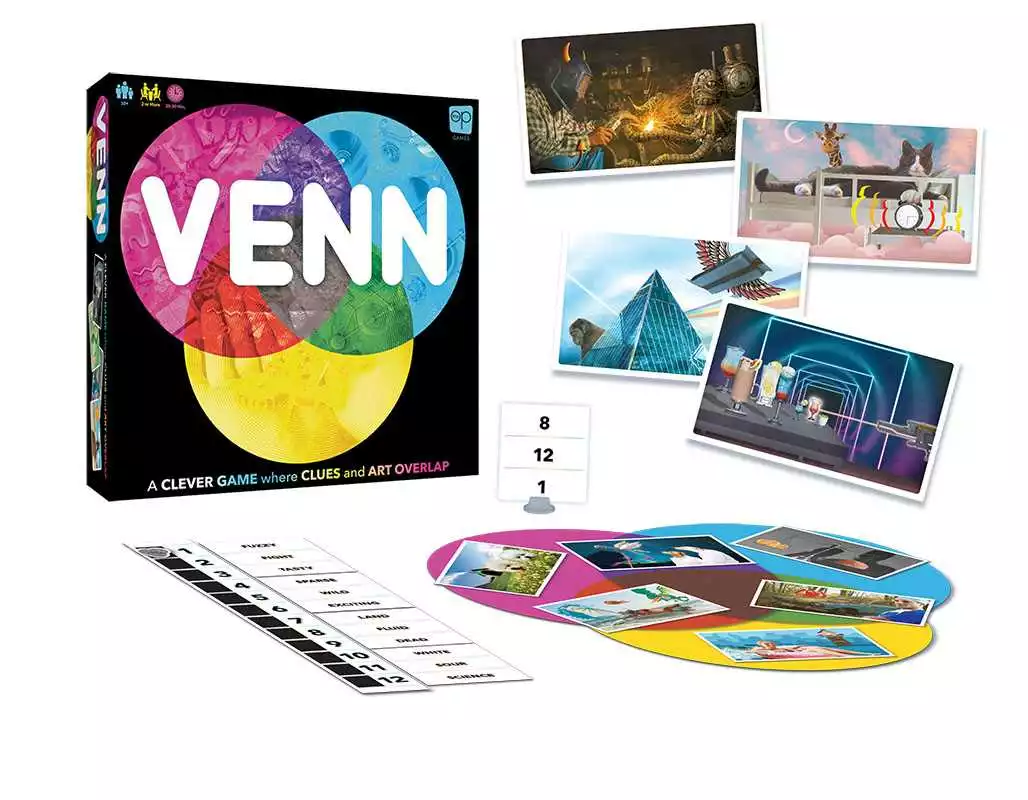 Your goal in Venn is to get your teammates to guess a secret code first. Twelve word cards will be laid out at random, and the code that the cluegivers see has three numbers on it from 1-12.