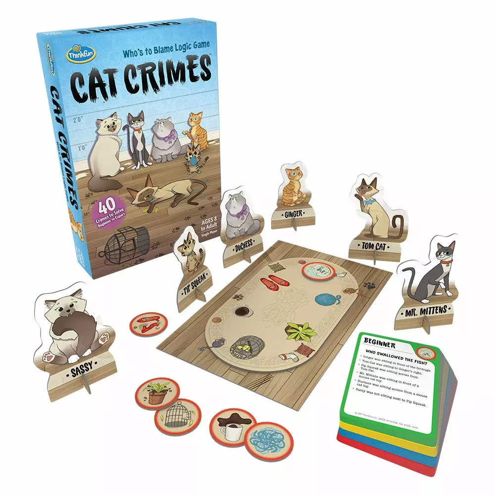 - WHAT YOU GET – Components are well made and durable, includes a game board, 6 cat pieces, 6 crime tokens, 40 challenges and solutions. For players aged 8+, with a fun theme and hilarious artwork.