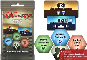 The third Dawn of the Zeds: Third Edition Expansion Pack features two new game systems. In the first, Refugees are more helpful than ever as they bring with them Rumors about incredibly useful items for the ongoing battle. All 16 Rumor chits provide heroes with special goodies or abilities when discovered.