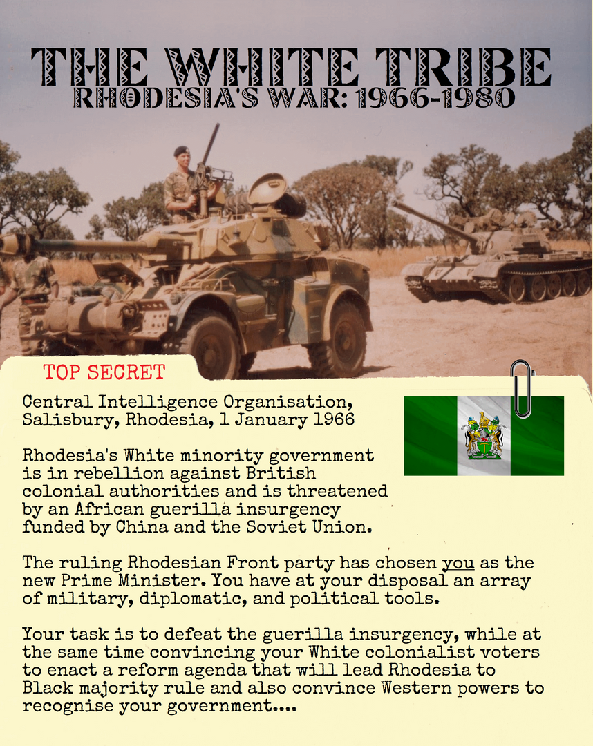 248928/white-tribe-rhodesias-war-1966-1980 http://boardgamegeek.com/boardgame/248928/white-tribe-rhodesias-war-1966-1980/forums/63 |