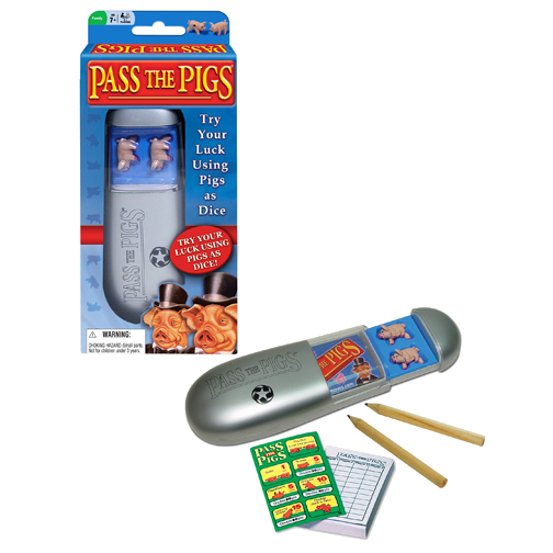The object is to be the first to score 100 points using “pigs” as dice. On your turn, you throw the pigs and hope they end up in a scoring position such as a “snouter,” “trotter,” or “leaning jowler” (ranging in value from 1 to 60 points); if they do, you decide whether to “cash” the points (pass the pigs to the next player) or to roll again. If you roll a non-scorer (“pig out” – one pig on the right flank, the other on the left flank; a fairly frequent result), you lose any as-yet-uncashed points. If you throw an “oinker” (both pigs touching each other), you lose your entire accumulated score. If you throw a “piggyback” (one pig on top of the other), you’re altogether eliminated!