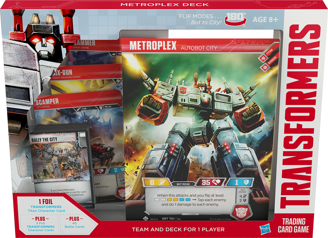 The Metroplex Starter Set contains cards for only one player, and it features Metroplex, Scamper, Six-Gun, and Slammer character cards as well as a forty-card deck of battle cards including three battle cards — Rally the City, Height Advantage and Protected by Metroplex — not available in the Autobots Starter Set or booster packs.