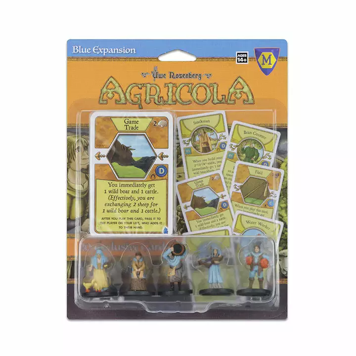 Agricola Game Expansion: Blue is both an upgrade kit for the revised edition of Agricola as well as an expansion. This item contains five pre-painted miniatures with colored accents that can replace one set of wooden player pieces from the base game. In addition, it contains twenty new cards for Agricola, including some that are exclusive to this expansion.