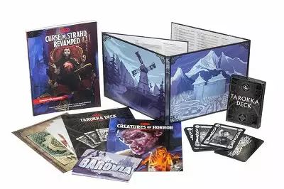 - Curse of Strahd: Revamped splits the adventure into three parts—a softcover D&D adventure book with updated content, a Creatures of Horror booklet detailing monsters and NPCs appearing in the adventure, and a Tarokka Deck booklet