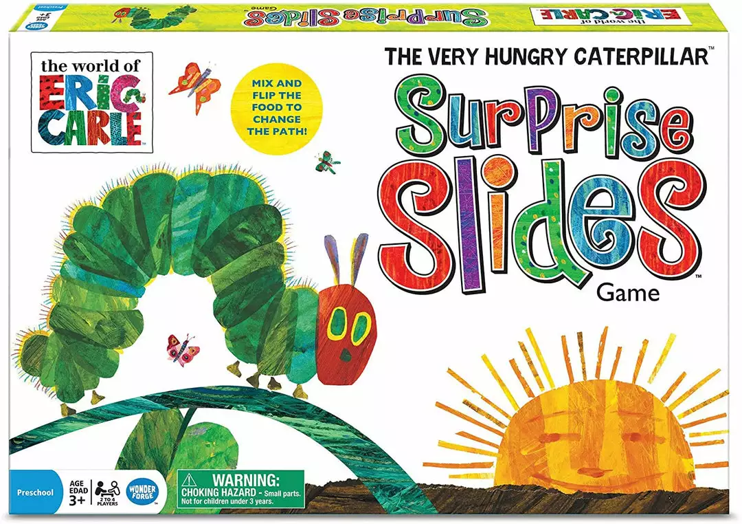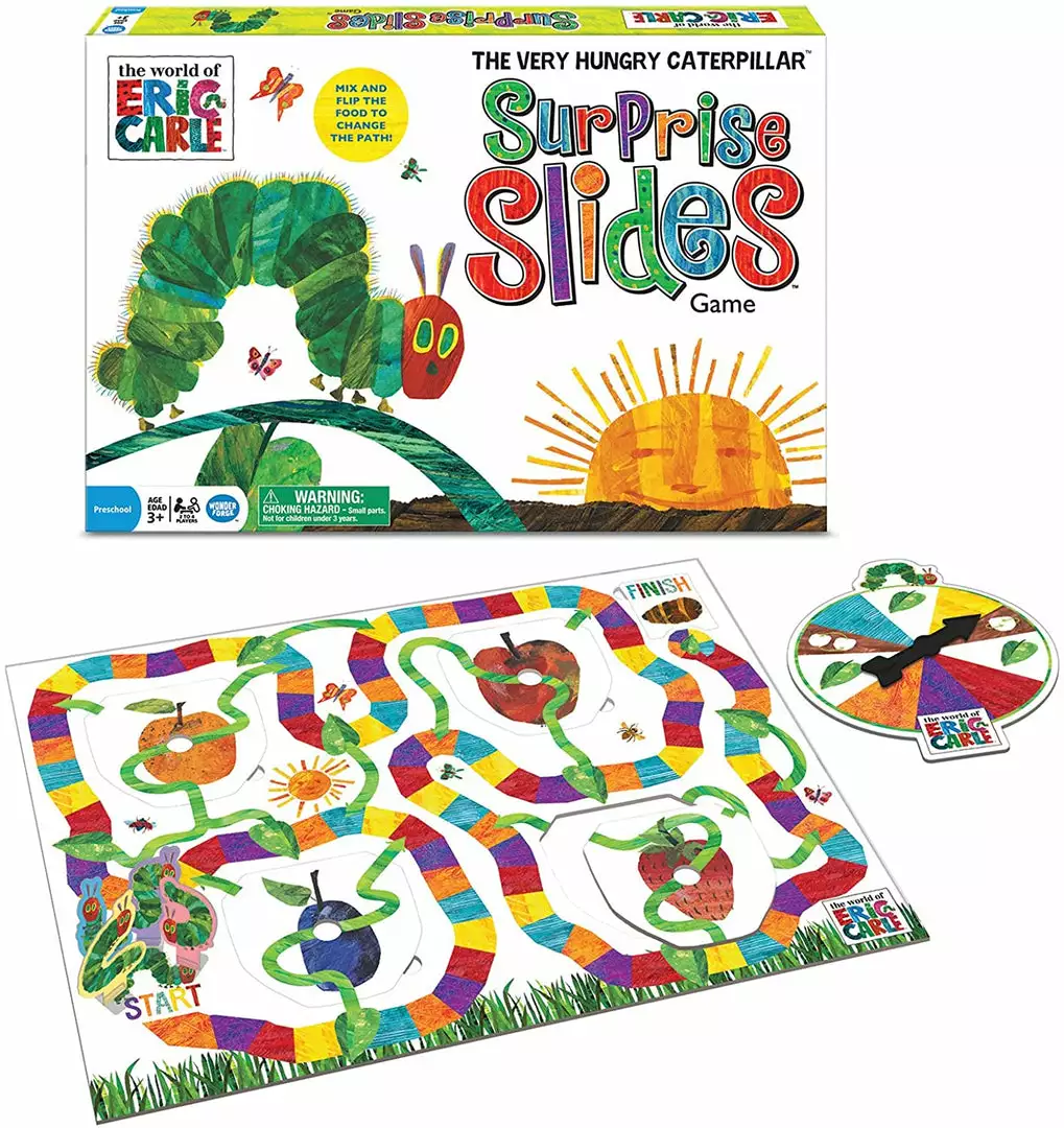 Flip some cake and eat it too with the very Hungry Caterpillar™! One sunny Sunday, the little caterpillar hatched out of a tiny egg. He was very hungry. Just like the very hungry caterpillar, eat your way through fruit and snacks alike, before you can build your cocoon and become a butterfly. But, be careful what you eat, a stomachache will set you back! You’ll never know when the food will mix and flip, filling your week with surprises! It’s a different game board every time you play!