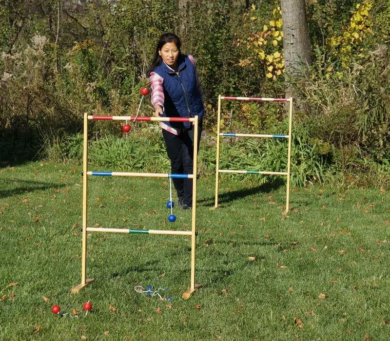 This Beautifully crafted wooden ladder toss set will make the perfect addition to your next outdoor event. This set comes with 2 durable finished wood frames and ladder rungs with built in scorekeepers, 6 real golf ball bolas (3 red, 3 blue) for two teams, a high strength nylon carrying case for easy storage and transport, and easy to learn game instructions.