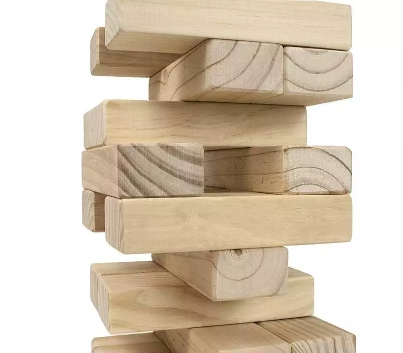 Tumbling Timbers can be played by 2 or more players. First, build the tower, then take turns to remove a block (using only one hand) and place on the top. The object is to be the last player to successfully stack a wooden block without knocking down the tower!