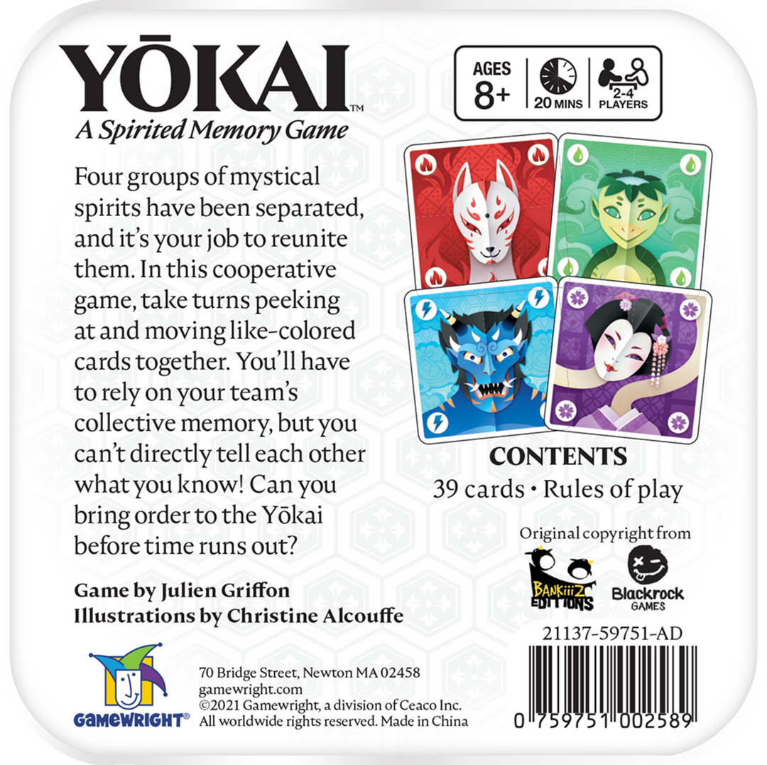 Four groups of mystical spirits have been separated and it’s your job to reunite them. In this cooperative game, take turns peeking at and moving like-colored cards together. You’ll have to rely on your team’s collective memory, but you can’t directly tell each other what you know! Can you bring order to the Yōkai before time runs out?