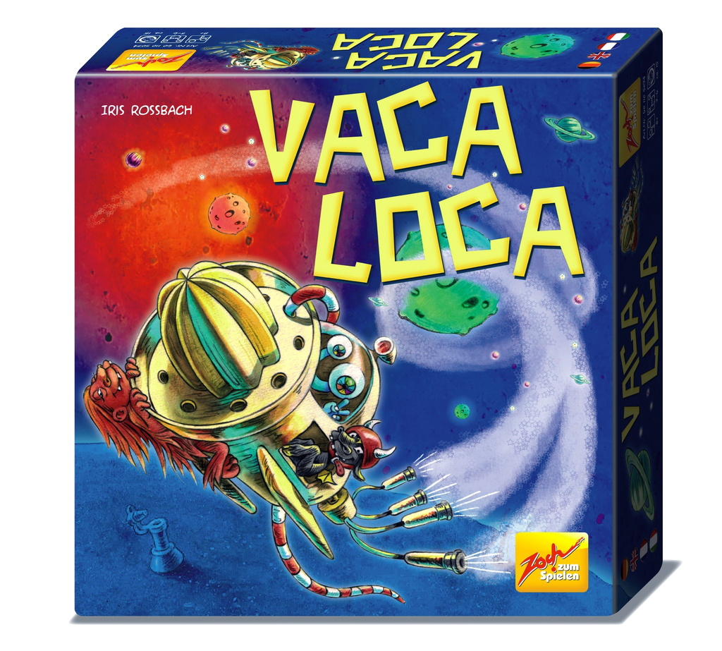Vaca Loca – “mad cow” in Spanish – contains 60 square tiles, with each tile showing the head, body or legs of one of twenty different alien animals. Place these sixty tiles face down on the table, then shuffle them. One by one, each player reveals a single tile. Whenever the third tile of an animal is revealed, players race to place their hand as quickly as possible on the head tile of that animal. The fastest player collects the three tiles of the completed animal, placing them in front of him. Anyone who places his hand on an incorrect tile receives a “planet token”, which is worth -1 point at the end of the game. Whoever ends up with the most points wins!