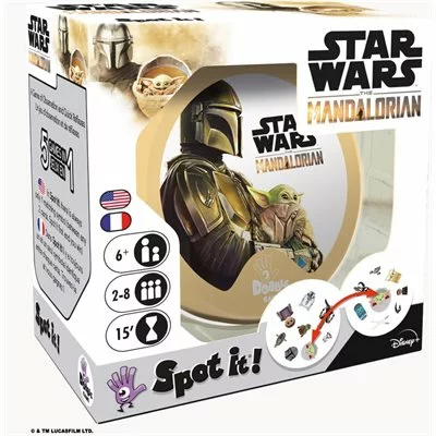 With Spot it! try to spot the unique matching symbol between every two cards in a playful battle of speedy observation. This new version of Spot it! combines emblematic characters and objects from the series The Mandalorian with the beloved family game! Featuring your favourite characters: The Mandalorian, Grogu, AhsokaTano, Kuiil and many more.